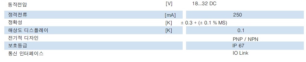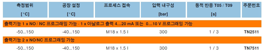 제품 특징 ● -50...150 °C의 측정범위, 반응시간 T05 / T09 = 1s / 3s ● 허용범위의 명백한 표시 프로그래밍 가능한 적색 / 녹색 디스플레이 ● VDMA 메뉴를 가진 3개의 누름 버튼을 통해 빠르고 쉽게 처리됨 ● 아날로그 버전 (4...20 mA/ 0...10 V)또는 스위칭 출력 (2 x PNP/NPN) ● 명확하게 가시적인 LED로 스위칭 상태의시각화 빠르고 내구성있음 프로브가 내장된 컴팩트한 타입 TN 유닛은 뛰어난 반응시간, 높은 압력 내구성 그리고 프로세스 연결 적응력이 특징입니다. 150°C까지의 온도와 300bar 까지의 고압 부하를 가진 어플리케이션에서 센서는 여유있는 내구성을 제공합니다. 측정영역은 자유롭게 확장축소될 수 있습니다. 기존 제품의 업데이트 새로운 특징으로는 세개의 누름 버튼으로 빠르고 쉽게 처리되는 점입니다. 디스플레이는 “적색” 표시로부터 “적색 - 녹색”이 교대로 표시되도록전환할수 있습니다. 그러므로 스위칭 상태가 강조되거나 독립적 색상 윈도가 생성될 수 있습니다. 센서 헤드는 회전될 수 있으며 모든 위치에서 최적의 가독성을 제공합니다. 유닛은스텐레스 하우징에 새겨진 레이저 라벨링으로 수년 후에도 여전히 식별가능합니다. 디지털 온도 센서 측정범위