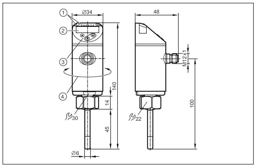 1) LED (디스플레이 유닛 / 스위칭 상태), 2) 4자릿수 알파벳숫자 디스플레이 /적색과 녹색의 교류 표시 3) 프로그래밍 버튼 4) 하우징의 상부는 345° 회전됩니다. 상세 기술 데이터