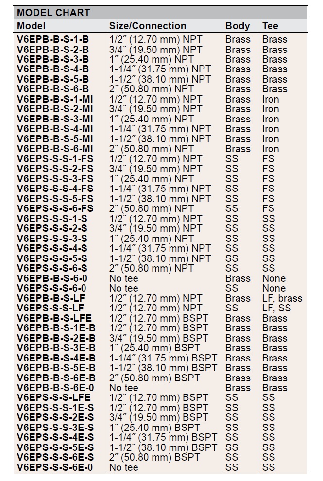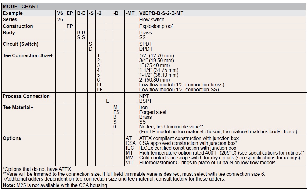 • 비상 샤워기 또는 세안대 사용 시 경보를 울립니다. SPECIFICATIONS Service: Gases or liquids compatible with wetted materials. Wetted Materials: Standard V6 models: Vane: 301 SS; Lower body: brass or 303SS; Magnet: Ceramic; Other: 301, 302 SS; Tee: Brass, iron, forged steel, or 304 SS. V6 low flow models: Lower body: Brass or 303 SS; Tee: Brass or 304 SS; Magnet: Ceramic; O-ring: Buna-N standard, Fluoroelastomer optional; Other: 301, 302 SS. Temperature Limits: -4 to 220°F (-20 to 105°C) standard, MT high temperature option 400°F (205°C) (MT not UL, CSA, ATEX, IECEx or KC) ATEX Compliant AT, IECEx IEC option and KC (KC option); Ambient temperature: -4 to 167°F (-20 to 75°C); Process temperature: -4 to 220°F (-20 to 105°C). Pressure Limit: Brass lower body with no tee models 1000 psig (69 bar), 303 SS lower body with no tee models 2000 psig (138 bar). Brass tee models 250 psi (17.2 bar), iron tee models 1000 psi (69 bar), forged and SS tee models 2000 psi (138 bar), low flow models 1450 psi (100 bar). Enclosure Rating: Weatherproof and Explosion-proof. Listed with UL and CSA for Class I, Groups A, B, C and D; Class II, Groups E, F, and G. (Group A on stainless steel body models only). ATEX 2813 II 2 G Ex db IIC T6 Gb Process Temp ≤75°C Alternate Temperature Class T5 Process Temp ≤90°C, 115°C (T4) Process Temp ≤105°C consult factory. EU-Type Certificate No.: KEMA 04ATEX2128. ATEX Standards: EN 60079-0:2012+A11:2013; EN 60079-1:2014.IECEx Certified: For Ex db IIC T6 Gb Process Temp≤75°C Alternate Temperature Class T5 Process Temp ≤90°C, 115°C (T4) Process Temp≤105°C consult factory. IECEx Certificate of Conformity: IECEx DEK 11.0039; IECEx Standards: IEC 60079-0:2011; IEC 60079-1:2014; Korean Certified (KC) for: Ex d IIC T6 Gb Process Temp ≤75°C; KTL Certificate Number: 12-KB4BO-0091. Switch Type: SPDT snap switch standard, DPDT snap switch optional. Electrical Rating: UL models: 5 A @125/250 VAC. CSA, ATEX and IECEx models: 5 A @ 125/250 VAC (V~); 5 A res., 3 A ind. @ 30 VDC (V ). MV option: .1 A @ 125 VAC (V~). MT option: 5 A @125/250 VAC (V~). [MT option not UL, CSA, ATEX or IECEx]. Electrical Connections: UL models: 18 AWG, 18˝ (457.20 mm) long. ATEX/CSA / IECEx models: Terminal block. Upper Body: Brass or 303 SS. Conduit Connections: 3/4˝ (19.05 mm) male NPT standard, 3/4˝ (19.05 mm) female NPT or M25 with BSPT option on junction box models. Process Connection: 1/2˝ (12.70 mm) male NPT or 1/2˝ (12.70 mm) male BSPT on models without a tee. Mounting Orientation: Switch can be installed in any position but the actuation/ deactuation flow rates in the charts are based on horizontal pipe runs and are nominal values. Set Point Adjustment: Standard V6 models none. Without tee models vane is trimmable. Low flow models are field adjustable in the range shown. See set point chartsu. Weight: 2 to 6 lb (.9 to 2.7 kg) depending on construction. Options not Shown: Custom calibration, bushings, PVC tee, reinforced vane, DPDT relays.