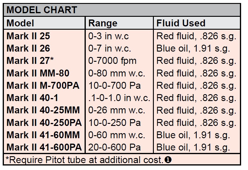 제품 설명 경사형 마노미터 시리즈 Mark II 성형 플라스틱 마노미터는 경사형 및 경사 수직형으로 제공됩니다. 모델 25 게이지의 곡선형 경사 수직 튜브는 낮은 측정값에서도 더 쉽게 읽을 수 있는 증분으로 더 높은 측정 범위를 제공합니다. 모델 25는 일반적인 작업에 적합합니다. 모델 40 경사 게이지는 전체 범위에 걸쳐 선형 교정과 뛰어난 분해능을 제공합니다. 모델 40은 풍속 및 공기 필터 게이지 응용 분야에 이상적입니다. 두 게이지 유형 모두 대기압 이상 및 이하의 압력 측정과 차압 측정이 가능합니다. 각 Mark II 마노미터에는 1/8인치 파이프 또는 판금 덕트용 튜빙 커넥터 2개, 장착 나사 2개, 1온스 지시액 병, 빨간색 및 녹색 포인터 플래그, 그리고 전체 설명서가 포함되어있습니다. 모델 25에는 8인치의 유연한 이중 컬럼 플라스틱 튜빙도 포함되어 있습니다. 모델 25는 옵션인 A-612 휴대용 스탠드를 사용하여 휴대하며 작동할 수 있습니다. 모델 25 압력 연결부 위로 짧은 튜빙을 끼워 운반 중 게이지 유체를 가둘 수 있습니다. 모델 40에는 4.5인치 길이의 투명 플라스틱 튜빙 두 개, 플라스틱 스윙아웃 스탠드, 그리고 이동식 작동을 위한 수평 조절 나사가 포함되어 있습니다. 또한 편리한 신속한 압력 차단 연결부와 내장형 과압 안전 트랩을 갖추고 있습니다. FEATURES/BENEFITS • 읽기 쉬운 교정된 단위의 광범위한 측정 범위 • 일반 측정 및 특정 공기 응용 분야에 이상적인 게이지