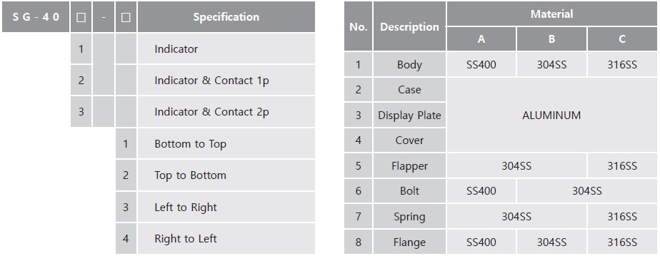 제품 특징 ■ FEATURE ■ APPLICATIONS • 접점 용량이 커 별도의 보조 릴레이 필요 없음 ▶ 화학 및 기타 공정 산업 • 사용 유량 범위가 넓음 • 첨가제(예: 촉매, 계면활성제, 폼 억제제, 유화제) • 불투명한 액체 및 슬러지 상태 유체에 적합 • 산, 염기, 인산염과 기타 염화물, 황산 물질 • Micro Swithch 기능 (옵션) • 응축수 과 냉각수 ▶ 정유 및 가스 산업 • 부식, 스케일링과 하이드레이트 억제제용 분사 설비 • 질소, 연도 가스 등 ▶ 수자원 산업 • 에어레이션 유역에 산소 살포 • 철 함량을 줄이기 위한 공기 분사 ▶ 조선 및 선박 • 평형수 ■ SG-40 Series General Specifications