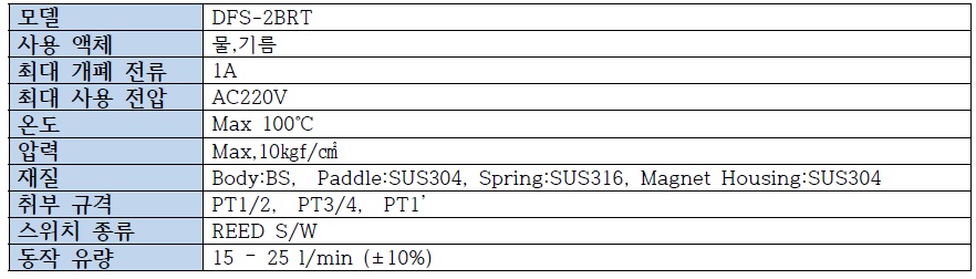 유량 스위치 DFS-2-BRT는 배관 내부에 유입된 액체의 흐름을 제품에 장치된 패들이 움직이면서 마이크로 스위치(Micro Switch) 또는 리드 스위치 (Dry Reed Switch)를 작동시켜 접점 출력 신호를 받아 경보 및 제어 장치를 On/Off 동작시켜 배관 유량의 흐름 유/무를 감지합니다.