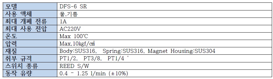 유량 스위치 DFS-6-SR Series 피스톤 유량스위치는 액체용 인라인 유량 스위치로서 고온,고압의 유체나 환경에 적합하도록 설계되었으며, 유량이 설정된 수치 이하로 흐르는 경우 외부에 접점 신호를 출력한다.구조가 간단하고 협소한 공간에 설치가 가능하기 때문에 반도체설비, 산업용 세척장비, 고압 윤활시스템 등 여러 분야로의 접목이 가능하다.