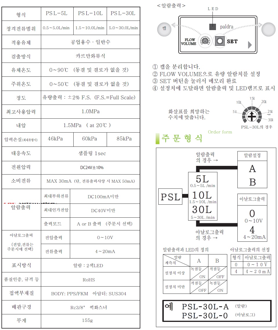 제품 특징 ・축소 기능으로 합리적인 가격 ・순간 유량 측정 ・아날로그 출력(전압 출력 DC0~10V)(전류 출력 4~20mA) ・알람 출력(A 또는 B 출력) ・습식 부품 소재 PPS, 최대 90°C의 고온의 물에 대응 ・유지 보수를 중시하고, 파이프에서 탈부착하기 쉬운 설계(퀵 패스너 사용)