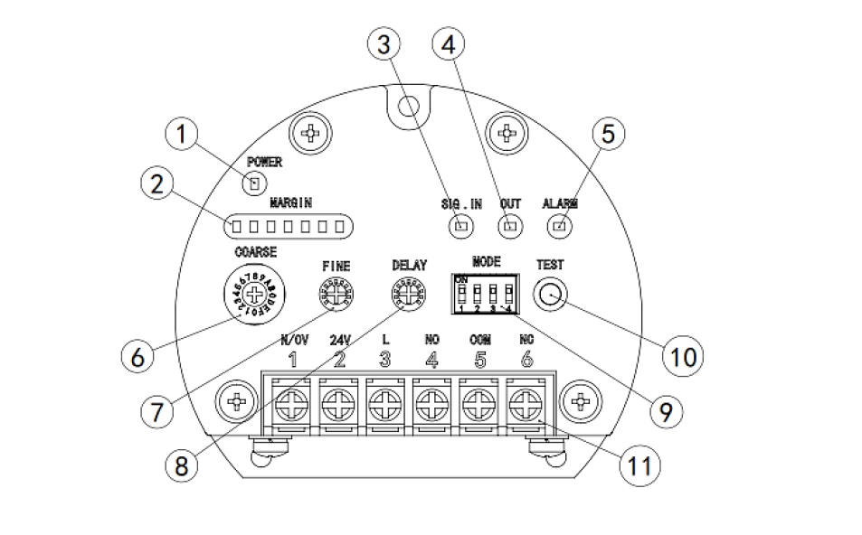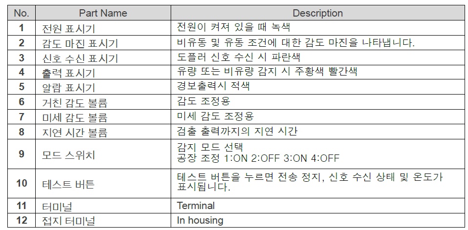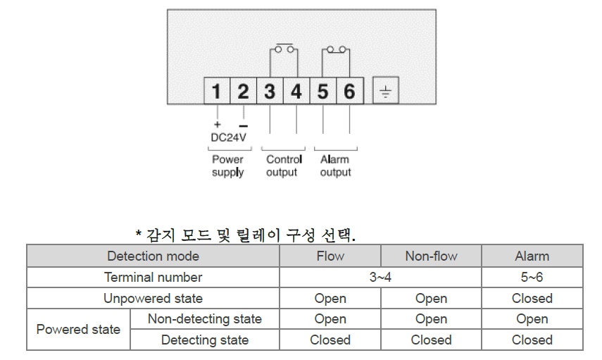 ![]() 스위치, 표시등 및 볼륨의 기능 ![]() ![]() 감도 조정 설치 및 배선이 끝나면 다음 사항을 확인하고 감도를 조정하십시오. 1. 전원을 켜면 전원 표시등 ① POWER(녹색)가 켜집니다. 2. 지연시간 가변저항 ⑧을 시계 반대 방향으로 돌려 최소값으로 설정합니다. 3. 거친 감도 가변 저항 ⑥을 시계 방향으로 완전히 돌려 최대로 설정합니다. 다음으로 미세 감도 가변 저항 ⑦을시계 반대 방향으로 완전히 돌려 최소로 설정합니다. 4. 파이프라인을 빈 상태로 운전하는 동안 출력 표시등 ④ OUT(주황색)이 꺼져 있는지 확인합니다. 출력 표시등④ OUT(주황색)이 켜져 있으면 거친 감도 가변 저항 ⑥을 시계 반대 방향으로 천천히 돌려 출력 표시등 ④ OUT(주황색)이 꺼지는 지점을 찾으십시오. 이것은 비유동 조건의 작동 지점입니다. 5. 검출하고자 하는 연속적인 유량으로 배관을 운전하는 동안 출력 표시등 ④ OUT(주황색)이 켜진 것을 볼 수 있습니다. 거친 감도 가변 저항 ⑥을 시계 반대 방향으로 천천히 더 돌려 출력 표시등 ④ OUT(주황색)이 꺼지는 지점을 찾습니다. 이것은 흐름 조건에 대한 작동 지점입니다. 6. 비유동 조건에 대한 작동 지점과 흐름 조건에 대한 작동 지점 사이의 중간에 거친 감도 가변 저항을 설정합니다. 이것이 감도 설정점입니다. 유량 및 비유동 작동 지점에서 감도 설정 지점까지의 마진은 감도 마진 표시기 ②를 통해 쉽게 볼 수 있습니다. 컨베이어 등과 같은 다른 기계의 진동 및 주변 소음은 흐름이 없는 상태에서 수신 전력 수준을 증가시켜 원치 않는 감지를 초래하는 경우가 있습니다. 필터 기능을 사용하여 여백을 늘리고 모드 스위치 4번 ⑨를 켜고 조정 절차(4~6단계)를 반복하여 원치 않는 감지를 방지할 수 있습니다. 7. 간헐적인 흐름을 감지하기 위해서는 지연시간 가변저항 ⑧으로 연속 감지 한계를 설정합니다. 8. 간헐적 흐름을 감지하지 않도록 모드스위치 2번⑨을 ON한 후 지연시간 가변저항 ⑧으로 비검출한계를 설정한다. 제품 사양