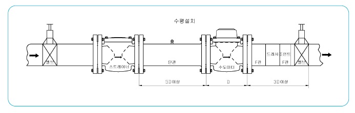 설치 설치 시 주의사항 ※ 적정한계량을확보하기위하여미터의입구쪽에미터구경의5배이상,구쪽에미터구경의3배이상의직관부거리를확보하여주십시오. 설치시모래나이물질이들어가지않도록주의하시고, 반드시수평으로 유체의흐름방향과몸체에표시된화살표방향이일치하도록확인하신※ 미터기후단에갑작스러운배관변경을금지하여주십시오.