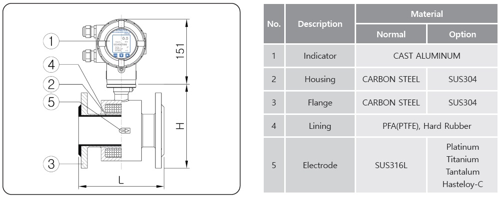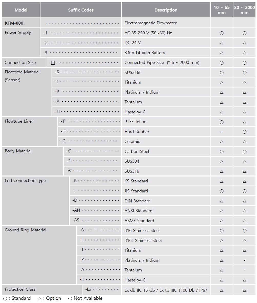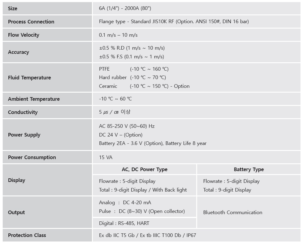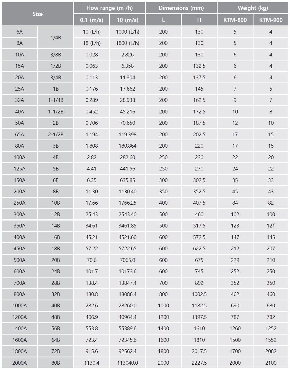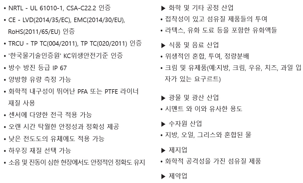 KTM-800 전자 유량계는(UL 인증) 전기 전도가 있는 유체를 사용하는 프로세스에서 유량 측정을 위해 특별히 설계된 전자기 유량계입니다. 최고의 기술이 집약 된 유량계는 특히 높은 정확도와 다양한 자기 진단이 필요한 현장에 적합합니다. 이 제품은 화학물질에 내구성이 강한 PFA 또는 PTFE라이너 재질을 사용하여 원자력 산업, 화학 및 기타 공정산업, 광물 및 광산 산업 및 수자원 산업 등에 적용 가능하며 전도도가 낮은 유체에서 또한 적용 할 수 있습니다. KTM-800 은 구동부가 없어 내구성이 우수하며 수명이 길고 기계적 유량계(예: 터빈 미터)보다 훨씬 더 큰 유량 비율(100 : 1)을 제공합니다. 또한 진동 및 소음이 심한 곳에서도 사용 가능하며 유지 보수가 쉽고 간단하여 각종 산업 현장에 널리 사용되고 있습니다. 제품 특징 ■ FEATURE ■ APPLICATIONS ![]() ■ KTM-800 General Specifications
