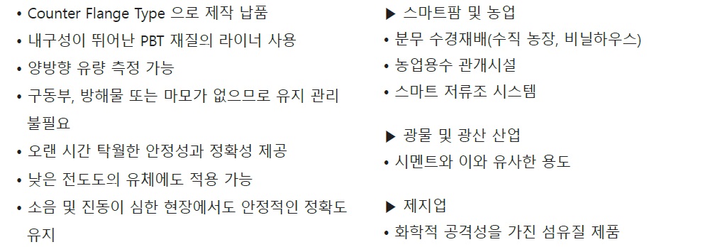 제품 소개 스마트 팜 전자 유량계 KTM-1000는 농업과 정보통신기술(ICT)을 접목하여 만들어지는 '스마트 팜' 전용으로 특수 제작 된 전자기 유량계입니다. 낮은 유속에서도 안정적으로 유량 측정이 가능하며 압력손실이 없습니다.