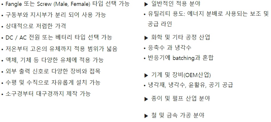 분리형 터빈 유량계 KTR-550-S-F 은 알코올, 톨루엔 등의 전기 전도도가 없는 유체에 적용가능하며 석유 가스, 발전소, 제약 및 펄프 & 제지 등의 산업 현장에 또한 이용 할 수 있습니다. 그러나 슬러지가 있거나 점도가 높은 유체에는 사용하지 않는 것을 권장 드립니다. 또한 플랜지 타입 또는 Screw (Male, Female) 타입으로도 제공 가능하여 다양한 배관 조건에 충족 가능합니다.