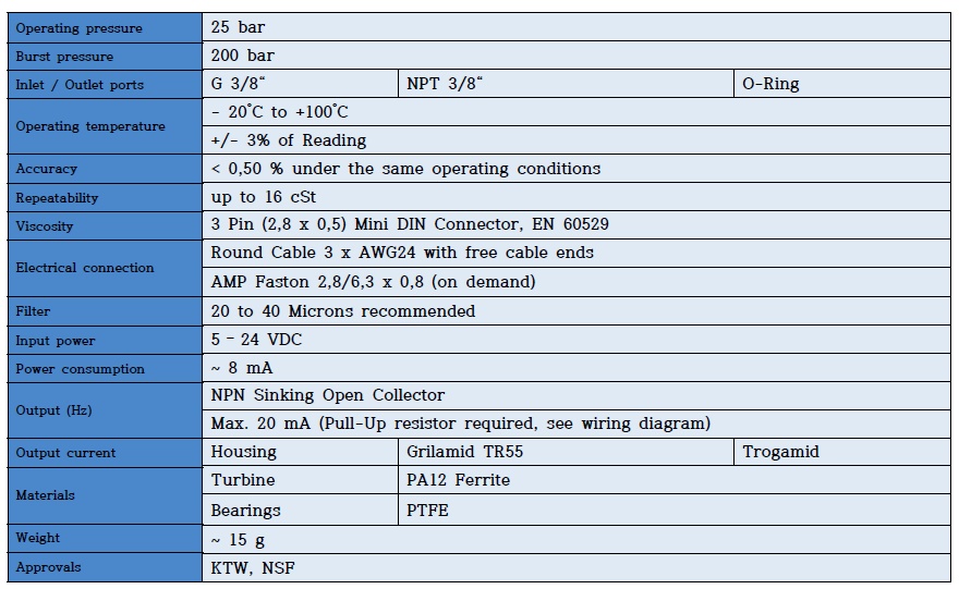 응용 프로그램 • 식품 산업 : 커피 기계, 자동 판매기, 분배 시스템, 제빵 기계, 및 증기선 • 의료 응용 프로그램 : 살균, 슬라이드 염색, 치과 물 제트, 투석 기계 • 화학 및 제약 산업 : 측광 시스템 • 산업용 : 냉각 시스템, 세탁기,식물, 주입 시스템, 수처리 장치, 필터시스템, 태양열 발전소 모니터링 • 자동차 : 연료 소비 측정 및 연료 분사 시스템