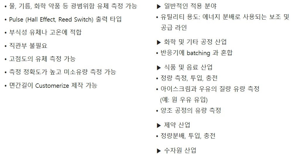 일정한 용적의 용기에 유체의 유입, 유출을 반복하여 단위 시간당 유입 및 유출 회수와 용기의 용적을 적산하여 유량을 측정하며, 유체의 유속이나 압력을 이용한 간접적인 측정 방식이 아닌 직접적인 부피를 측정하므로 높은 측정 정확도를 가지고 있습니다.