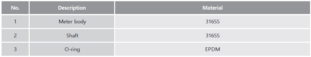 ■ STANDARD MATERIAL ■ PIPE CONDITION 1. KTP-5000 Serise는 직관부가 필요하지 않지만 유량계 바로 전단에 반쯤 열린 밸브가 있는 등 기포가 발생할 우려가 있는 경우 에는 유의하여야 한다. 2. 유량계 주변에는 점검 등이 가능하도록 바이패스 배관을 설치하여야 한다. (하단 배관도 참조) 3. 액체 중에 기포가 있으면 측정 오차의 원인이 되므로 기체 분리기(Air Eliminator)를 유량계 상류 측에 설치 하여야 한다. 4. 유량계 전∙후단에 밸브가 있는 경우에는 직사광선 등에 의하여 유체가 팽창하여 유량계가 파손될 우려가 있으므로 릴리프밸브 등을 설치하여야 한다. 5. 유체가 물인 경우에는 물이 동결되어 유량계가 파손될 우려가 있으므로 유의하여야 한다. 6. 스트레이너는 유량계 바로 전단에 설치한다. 만일 유량계와 스트레이너 사이에 배관이 있는 경우에는 내부를 충분히 청소하여 주어야한다. 7. 유량계는 펌프의 출구측에 설치하여야 한다. 펌프의 입구측은 압력이 낮기 때문에 유량계의 압력손실보다 압력이 낮은 경우에는 유량계가 회전하지 않는 경우가 생길 수 있다. ■ INSTALLATION 1. 유량계의 접속부를 막고 있는 포장재는 설치하기 전까지 제거하지 않도록 하여 유량계 내부에 먼지 등이 들어가지 않도록 한다. 2. 설치시 유량계를 떨어뜨리거나 충격을 주지 않도록 유의하여야 한다. 특히 플랜지나 나사부 표면에 흠이 나지 않도록 유의하 여야 한다. 3. 유량계에 표시된 유동방향과 실제 유체의 유동방향이 일치되도록 하여야 한다. ■ INSTALLATION PRECAUTIONS
