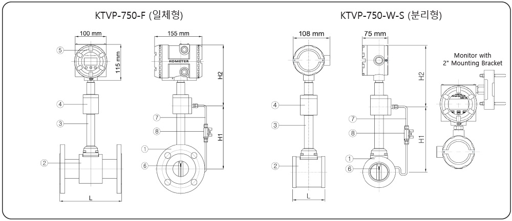 제품 소개 볼텍스 유량계 KTVP-750는 온⦁압 센서가 내장된 와류식 유량계입니다. 유량측정 메커니즘에 온도와 압력 보정기능을 일체화하여 배관 조건이 유동적인 환경에 적용가능하여 다양한 산업 현장에 적용 가능합니다. 이 제품은 액체, 건식 또는 습식 가스와 포화 또는 과열 증기 (스팀) 의 유량 측정에 가장 적합하며 높은 온도의 유체에서도 높은 정밀도를 유지합니다.