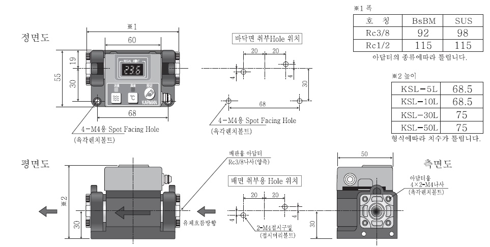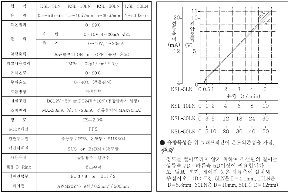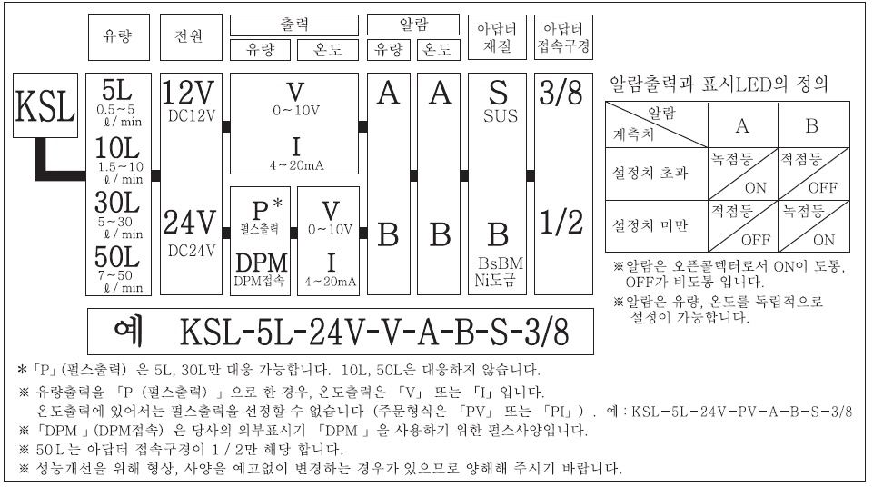 ・알람 출력(유량, 온도) ・아날로그 출력(전압 출력 DC0~10V)(전류 출력 4~20mA) ・펄스 출력(유량, KSL-5L/30L 타입에 한함)