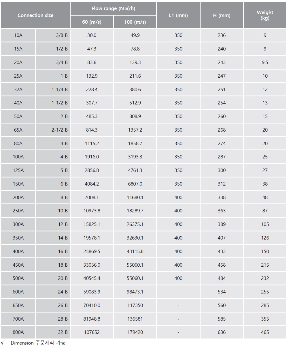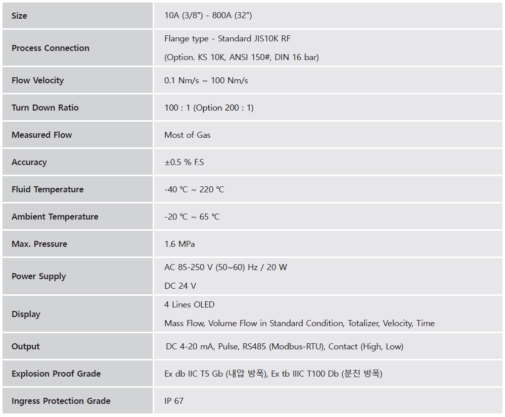 ![]() 열식 질량 유량계 KMSG-8000MT (UL 인증) 제품 소개 열식 질량 유량계 KMSG-8000MT 는 기체를 유체로 사용하는 프로세스에서 유량 측정을 위해 특별히 설계 된 열식 질량 유량계입니다. 최고의 기술이 집약 된 유량계는 특히 높은 정확도와 다양한 자기 진단이 필요한 현장에 적합합니다. 이 제품은 대기 중에 분포하고 있는 다양한 기체뿐만 아니라 부식성이 있는 기체, 비중이 작아 측정하기 어려운 난이도 있는 기체에도 적용 가능하여 각종 발전소, 반도체 산업, 석유 화학 분야 및 반도체 산업 등 다양한 산업 현장에 적용 할 수 있습니다. 열식 질량 유량계 KMSG-8000-MT 은 구동부가 없어 내구성이 우수하며 수명이 길고 기계적 유량계보다 훨씬 더 큰 유량 비율(200 : 1)을 제공합니다. 또한 진동 및 소음이 심한 곳에서도 사용 가능하며 온도와 압력이 자동으로 보정 되므로 현장 조건이 일정하지 않은 배관에도 적합합니다. 제품 특징 ■FEATURE ■APPLICATIONS ![]() ■ Introduction 1900년대 초반부터 만들어진 열선식 질량 유속계는 유속 및 난류 연구를 위해 실험실에서 사용되기 시작하였습니다. 그때 당시 제품은 얇고, 깨지기 쉬워 실용적이지 못하였습니다. 또한 유체의 온도와 압력 변화에 대해 자동으로 보상받지 못하였습니다. 작은 크기 때문에 속도에 대한 반응은 빨랐지만 먼지 등의 파손에 극도로 취약했던 이 센서는 다양하고 실용적인 프로세스의 산업 현장에서 적용되기위해 개선을 끊임없이 요구 받았습니다. 한국유량계공업(주)는 위와 같은 취약점을 인지하여 이물질로 인한 파손 및 손상에 더 강하고 온도와 압력이 자동으로 보상되는 기능을 가진 일체형 듀얼 열선식 센서를 개발하였습니다. ![]() Figure 1 - KOMETER Thermal Sensors ■ Voltage & Flow Velocity KMSG Series 는 오랜시간동안 테스트하여 누적 된 데이터를 기반으로 유체별 열전달계수를 산출하고,그 산출 된 데이터를 제품에 적용합니다. 아래 쪽 그래프는 유속에 따른 Thermal Sensor의 Voltage 값을 보여줍니다. 유속이 빨라져 Heating Sensor의 열손실이 높아질 수록 일정한 온도를 유지해야하는 Heating Sensor는 추가적인 Voltage가 요구됩니다. ![]() Figure 2 은 유체가 Air 이고 0 ℃, 1atm 일 때의 조건으로 테스트 된 Velocity Calibration Curve를 보여줍니다. 흐르는 유체가 변하거나 온도, 압력 조건이 변할 경우 Curve의 특성(기울기, x=0 일때 y축의 값 등)은 변합니다.