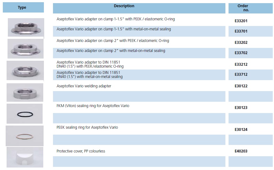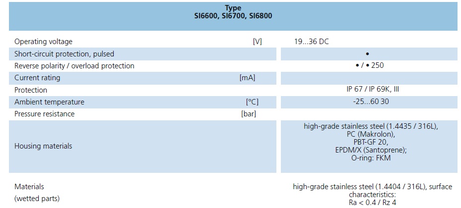 제품 특징 위생영역에서의 프로세스 접속을 위한 준비 및 테스트 완성 온도가 120 °C까지인 매체용으로 적합 스위치 포인트 및 유량상태의 디스플레이를 위한 LED 막대 그래프 프로세스 어댑터가 액세서리로 포함됨 매체(물)와 접촉되는 공업재질: 고품질 스텐레스(1.4435 / 316L)