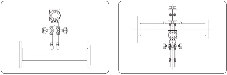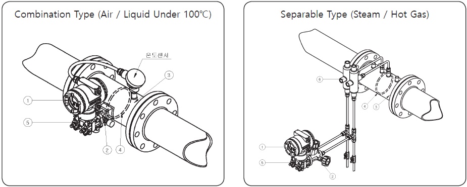■ INSTALLATION PRECAUTIONS 1. 주 배관의 경과 시험 배관의 경은 반드시 일치할 필요는 없음. 2. 유량계의 전∙후 배관은 정도 유지를 위하여 직관부가 필요함. (elbow를 사용하는 경우 전단 10 D, 후단 5 D의 직관부로 설계)
