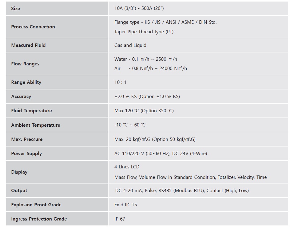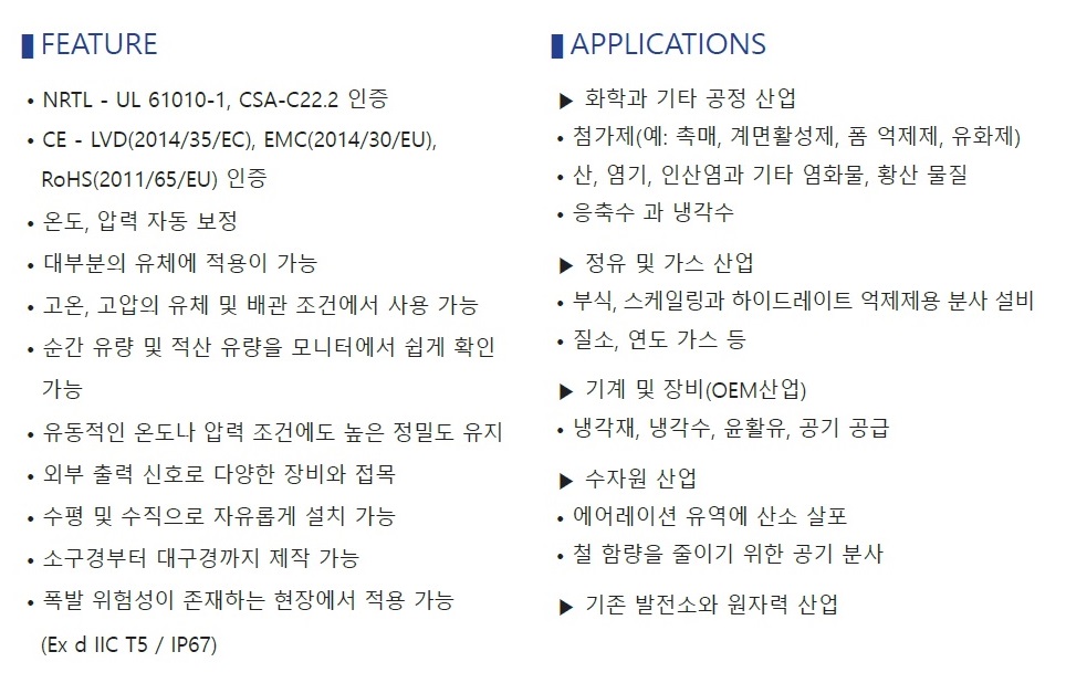 제품 소개 UL 인증 차압 유량계 DPE-S-PT는 오리피스 바디에 차압 트랜스미터를 장착하여 현장에서 순시 유량과 적산 유량을 확인 할 수 있는 차압 유량계입니다. 유량 신호를 외부로 송신하여 확인 할 수 있으므로 여러 주변기기와 연동하여 제어 가능 합니다. 대부분의 유체(액체⦁기체 및 포화증기)에 적용 할 수 있고 고온, 고압의 현장에도 사용 가능하여 거의 대부분의 산업 현장에서 이용 할 수 있습니다. 배관 적용 시 수평 및 수직으로 자유롭게 설치가 가능하며 소구경부터 대구경까지 제작되기 때문에 용이합니다. 이 제품은 화학물질, 석유 & 가스, 발전소, 철 & 금속 가공 등의 전반적인 산업 현장에 모두 적용 가능합니다. 또한 온도와 압력이 자동으로 보정되어 배관 내 온도와 압력이 일정하지 않은 현장에서도 높은 정밀도를 유지합니다.