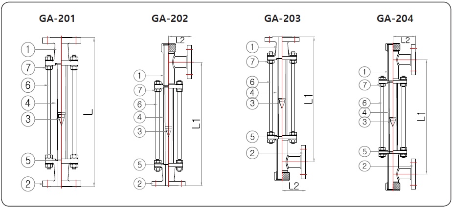 제품 소개 유리관 면적 유량계 GA-20 Series는 플로트의 중심을 잡아주는 가이드를 제거하여 유체속의 이물질 등에 의한 플로트와 가이드 사이의 끼임 현상이 없도록 고안 된 유리관 면적 유량계로 유체의 흐름과 순간 유량을 쉽게 판독 하며 소유량 측정에 적합합니다. 이 제품은 설치 및 보수가 용이하여 일반적으로 산업현장에 널리 사용되고 옵션으로 알람 스위치와 벨브를 선택하여 제작 할 수 있습니다. 제작 시 배관 연결 부위를 자체 가공하므로 유체의 진입, 진출 방향을 자유롭게 설정 할 수 있어 다양한 배관에 응용 할 수 있습니다. 또한 바디 재질뿐만 아니라 제품 내부의 플로트. 테이퍼 튜브 등의 재질도 다양하게 선택할 수 있어 대부분의 유체(액체⦁기체)에 적용 가능합니다.