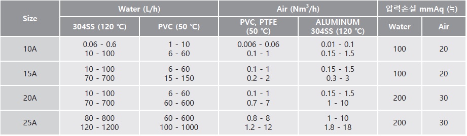 제품 특징 • 전원 장치 없이 사용하는 현장 지시 유량계 • 전단 or 후단에 벨브 설치 가능 / 알람 기능 선택적으로 제공 • 유체의 순간 흐름 쉽게 확인 가능 (거품, 색상 등) ■ GA-20 Series General Specifications ![]() ■ MODEL CODE ■ STANDARD MATERIAL ![]()
