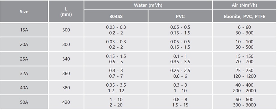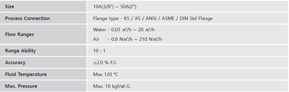 제품 특징 • 전원 장치 없이 사용하는 현장 지시 유량계 • 전단 or 후단에 벨브 설치 가능 / 알람 기능 선택적으로 제공 • 유체의 순간 흐름 쉽게 확인 가능 (거품, 색상 등) ■ GA-50 Series General Specifications