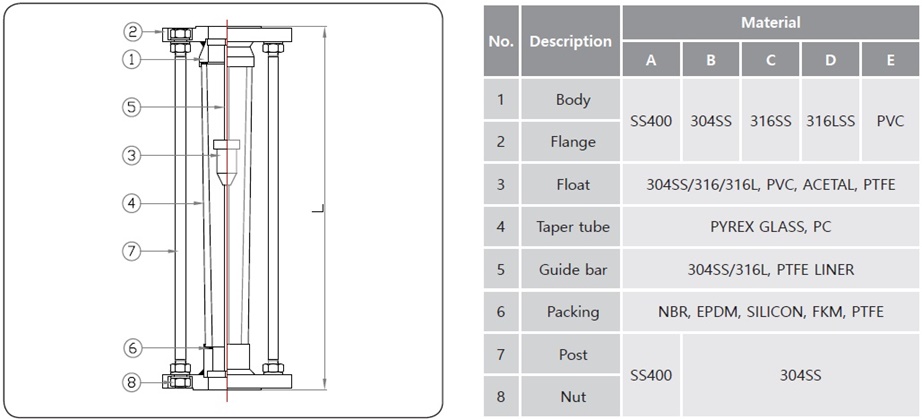 제품 소개 유리관 면적 유량계 GA-501는 제품을 설치 할 공간이 충분하지 않은 때 적용하기 좋은 유리관 면적 유량계로 일반적으로 GA-10 Series와 동일한 원리로 작동합니다. 소구경 보다는 대구경, 대유량에 적합하도록 설계하였으며 압력 변화에 의한 투명관의 파손을 최소화 할 수 있도록 특수 설계 되었습니다. 제작 시 배관 연결 부위를 자체 가공하므로 유체의 진입, 진출 방향을 자유롭게 설정 할 수 있어 다양한 배관에 응용 할 수 있습니다. 또한 바디 재질뿐만 아니라 제품 내부의 플로트. 테이퍼 튜브 등의 재질도 다양하게 선택할 수 있어 대부분의 유체(액체⦁기체)에 적용 가능합니다.
