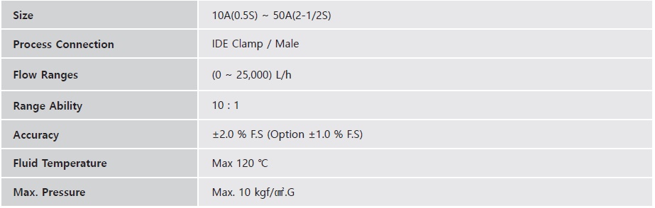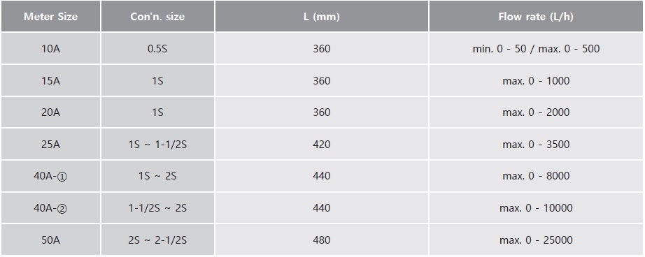 제품 특징 • 전원 장치 없이 사용하는 현장 지시 유량계 • 전단 or 후단에 벨브 설치 가능 / 알람 기능 선택적으로 제공 • 유체의 순간 흐름 쉽게 확인 가능 (거품, 색상 등) ■ GA-60 Series General Specifications