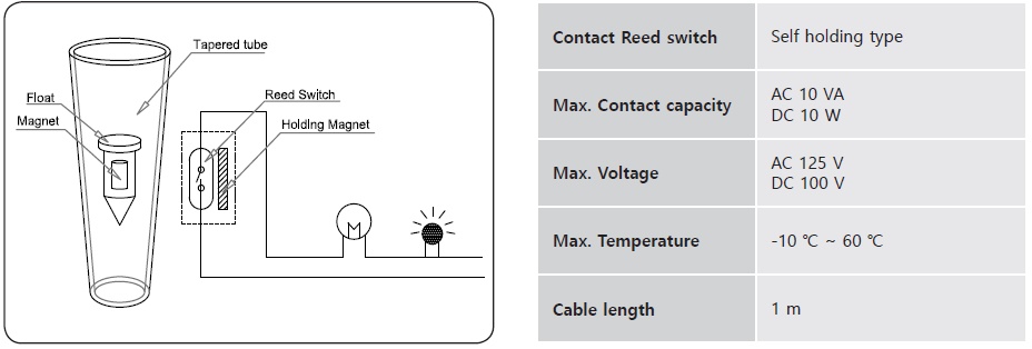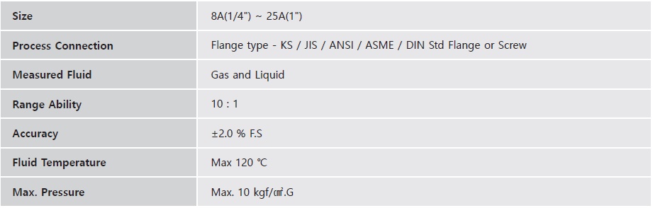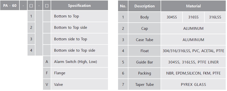 제품 특징 • 전원 장치 없이 사용하는 현장 지시 유량계 • 전단 or 후단에 벨브 설치 가능 / 알람 기능 선택적으로 제공 • 유체의 순간 흐름 쉽게 확인 가능 (거품, 색상 등) ■ PA-60 Series General Specifications