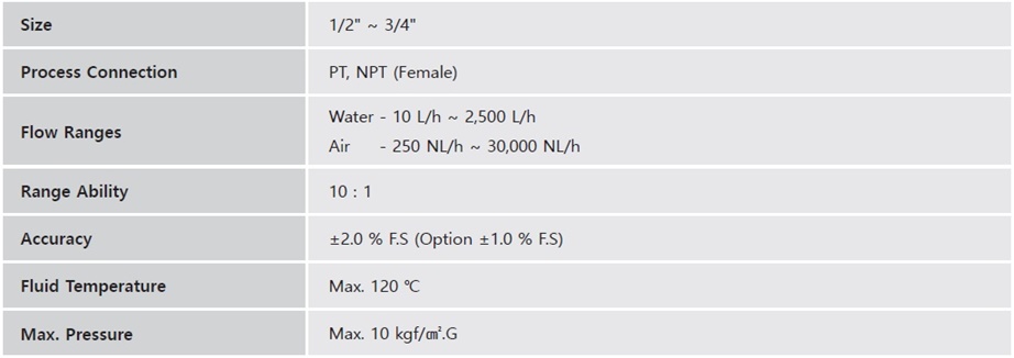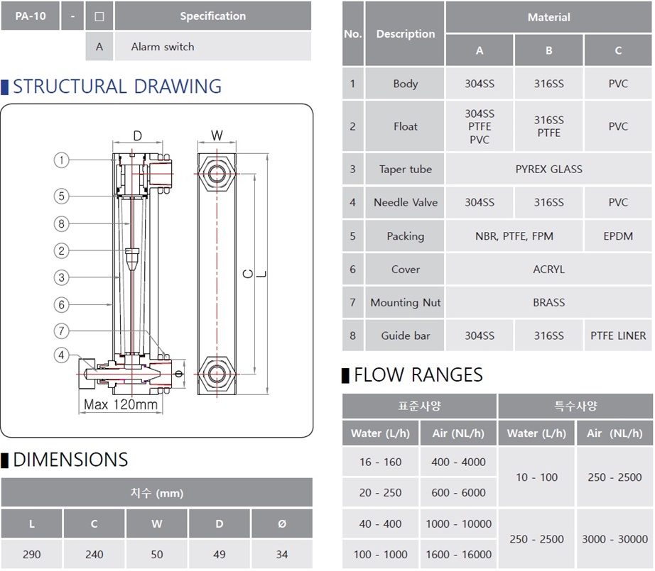판넬 유량계 PA-10 제품 소개 판넬 유량계 PA-10 Series 는 보조 전원 공급 장치 없이도 측정 및 지시가 가능한 판넬형 면적 유량계로 유체의 흐름과 순간 유량을 쉽게 판독 할 수 있는 특징이 있습니다. 액체 및 기체의 유량 측정에 모두 적합하며 구조가 간단하고 외관 디자인이 콤팩트하게 설계되어 각종 기기 및 설비에도 잘 부합됩니다. 또한 설치 및 보수가 용이하여 일반적으로 산업현장에 널리 사용되고 옵션으로 알람 스위치를 추가하여 제작 할 수 있습니다. 접속부는 관형나사로 되어있으며 판넬에 부착하여 사용 할 경우에는 접속부의 외부나사를 이용하여 사용 가능합니다. 제품 특징 Variable Area Flowmeter • 전원 장치 없이 사용하는 현장 지시 유량계 • 작은 공간에 적합하도록 디자인 되어 일반 공장 배관 라인 및 판넬 등 쉽게 취부 가능 • 유체의 순간 흐름 쉽게 확인 가능 (거품, 색상 등) ■ PA-10 Series General Specifications