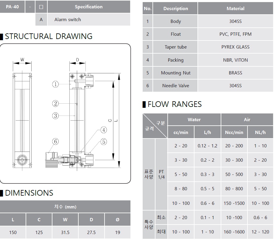 판넬 유량계 PA-40 Series 는 초 미소유량 측정에 적합하도록 특수 제작 된 판넬형 면적 유량계입니다. 일반 공장의 배관 라인에 직접 설치하는 것도 가능하며 연구실이나 실험실에서 데이터 측정용으로도 널리 사용됩니다. 액체 및 기체의 유량 측정에 모두 적합하며 구조가 간단하고 외관 디자인이 콤팩트하게 설계되어 각종 기기 및 설비에도 잘 부합됩니다. 또한 설치 및 보수가 용이하여 일반적으로 산업현장에 널리 사용되고 옵션으로 알람 스위치를 추가하여 제작 할 수 있습니다. 접속부는 관형나사로 되어있으며 판넬에 부착하여 사용 할 경우에는 접속부의 외부나사를 이용하여 사용 가능합니다.