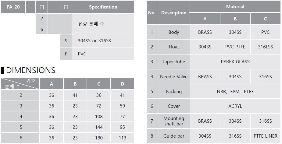 제품 특징 Variable Area Flowmeter • 전원 장치 없이 사용하는 현장 지시 유량계 • 작은 공간에 적합하도록 디자인 되어 일반 공장 배관 라인 및 판넬 등 쉽게 취부 가능 • 유체의 순간 흐름 쉽게 확인 가능 (거품, 색상 등) ■ PA-70 Series General Specifications