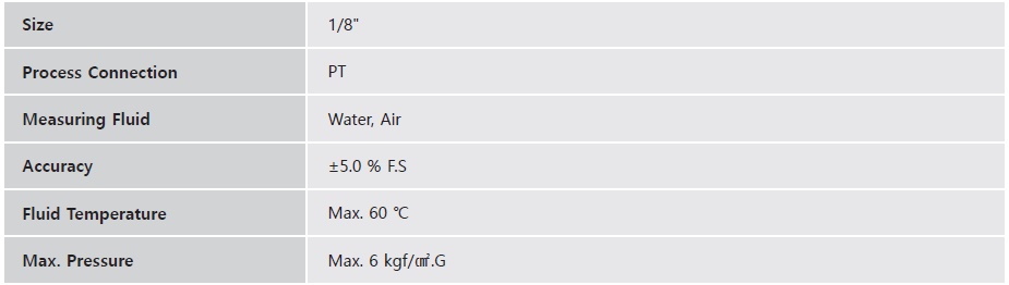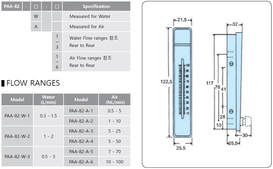 아크릴 유량계 PAA-82제품 소개 아크릴 유량계 PAA-82 ![]() 아크릴 유량계 PAA-82 제품 소개 아크릴 유량계 PAA-82 Series는 소유량의 기체 및 액체에 사용되며 디자인이 컴팩트하고 쉽게 설치, 세척 및 교체 할 수 있습니다. 본체는 PC (Polycarbonate)로 만들어졌으며, 밸브는 별매입니다. 직접 눈금을 판독할 수 있게 디자인 된 이 제품은 저렴한 가격으로 많은 용도에 사용 할 수 있습니다. 일체형으로 제작 된 유량계 본체는 플로트가 흔들리지 않도록 유량 전 범위에서 안정화시켜줍니다. 또한 배경이 밝아 플로트가 잘 보입니다. 제품 특징 Variable Area Flowmeter • 전원 장치 없이 사용하는 현장 지시 유량계 • 작은 공간에 적합하도록 디자인 되어 일반 공장 배관 라인 및 판넬 등 쉽게 취부 가능 • 유체의 순간 흐름 쉽게 확인 가능 (거품, 색상 등) ■ PAA-82 Series General Specifications