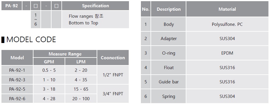 제품 소개 아크릴 유량계 PA-92 Series 는 아크릴로 제작 된 면적 유량계로써 내부에 스프링이 장착되어있어 수직라인 및 수평라인에 모두 적용하여 사용 할 수 있는 유량계이다.