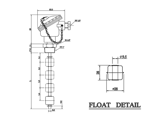 센서 외부 후루트(Float)는 부력에 의하여 동작되는데 후루트 내의 자석이 리드 시위치를 작동(On/Off)시키므로서
