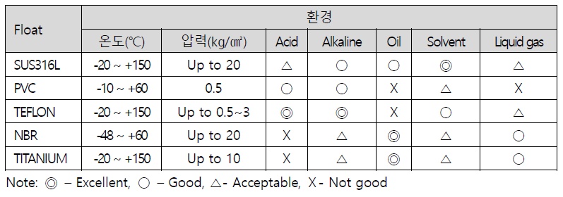 ![]() Stainless Steel (Flange Mounting) ![]() Stainless Steel (Screw Mounting) ![]() PVC ![]() TEFLON ![]() F loat 적용 사양 ![]()