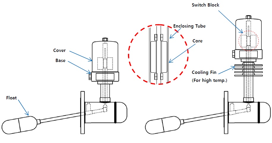 제품 동작원리 측정물의 수위가 상승하면 부력에 의해 플로트(Float)가 상승하면서, 플로트와 연결된 코어(Core)가 수직으로 이동합니다. 코어가 이동하면 스위치 블록(Switch Block) 내의 자석(Magnet)이 반응하여 마이크로 스위치(Micro Switch)를 동작 시킵니다.