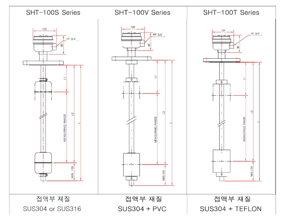 제품 소개 레벨 트랜스미터 SHT-100 레벨 트랜스미터 SHT-100 제품 개요 Float와 Guide Pipe는 부식성 및 내식성이있는 재질을 광범위하게 선택할 수 있으며 부식성있는 측정물에 견딜 수 있도록 생산 하였습니다. 여러번의 시험 과정을 거친 이 액면 전송기(SHT-100 Series)는 진공 상태에서부터 최대 압력 30Kgf/cm2에 견딜 수 있다. 제품 적용 - 물,우유,맥주,탄산음료 탱크의 액면검출.