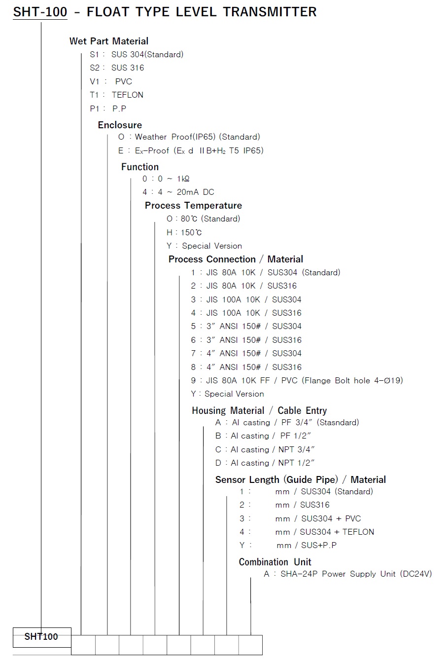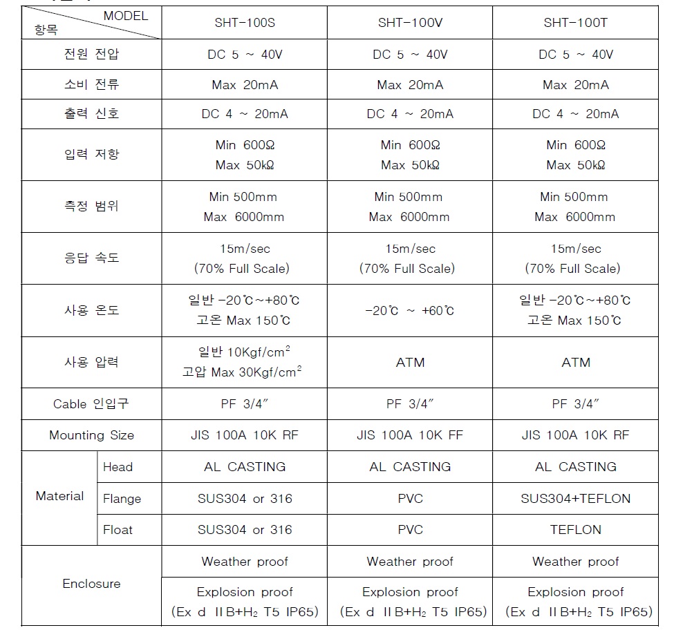 측정 시스템 측정 시스템은 다음과 같이 구성되어 있다. - FLANGE - GUIDE PIPE & FLOAT - SHT-100 ELECTRONIC INSERT - HOUSING ◎ STANDARD : AL CASTING HOUSING (PROTECTION : WEATHER -PROOF IP65) ◎ OPTION : AL CASTING HOUSING (PROTECTION : EX - PROOF (EX d ⅡB+H2 T5 IP65))