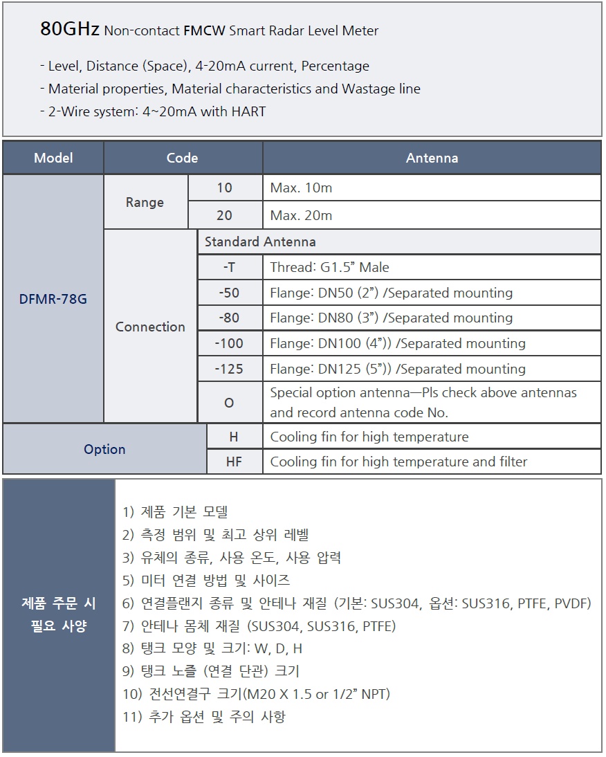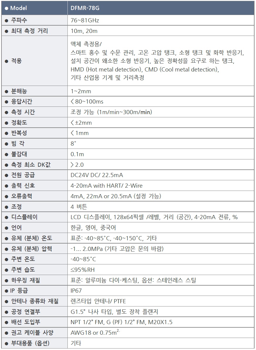 DFMR 78G 레이더 레벨 미터는 76~81GHz 로 운용되는 주파수 연속 변조방식 Frequency Modulated Continuous Wave method (FMCW) 의 비 접촉 식 레이 더 레 벨 미 터 이며 수처리 및 기타 액체 전용 레이더 수위계 입니다