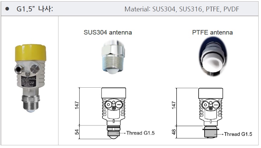 ⚫ 주파수 변조 신호를 연속 발사하여 수신된 신호와의 주파수차이 (Δf) 이용 ⚫ 전송주파수는 시간에 linear 하게 증가하고 변조 지속시간은 반사파가 되돌아오는 시간 이상 유지 ⚫ 송수신 신호의 주파수 차이는 전송 신호의 시간 지연 차이 ( 에 비례 Δf = (df/dt)*T (df/dt is the swept frequency rate of change) a = c*T/2 ■ 제품 특징 ⚫ 새롭게 개발한 CMOS millimeter wave RF chip 을 기반으로 보다 세련된 RF architecture 를 실현하였으며신호 대 잡음 비율을 높여 작은 불감대 Dead band: 80mm) 를 갖도록 하였다 ⚫ 5GHz 작동 주파수 대역폭은 더 높은 측정 분해능과 정확도를 의미한다 ⚫ 안테나 빔 각도는 8 °로 , 주변 환경 및 수증기의 간섭을 최소화할 수 있다 ⚫ 2mm 의 오차를 가질 정도로 정확도가 좋다 ⚫ 짧은 파장은 주파수의 반사 특성을 높이도록 되어 있다 ⚫ 8 의 빔 각도와 자기 적응형 자동 이득 알고리즘 기능을 가지고 있어 피 측정 체 의 표면 반사 지점을 쉽게 찾을 수 있다 ⚫ 반응 시간이 짧고 80~100ms) 측정 주기를 조정 가능하다 0.5~300m/Mi n) ⚫ 가짜 에코 주파수를 쉽게 제거할 수 있다 ⚫ PTFE 렌즈 안테나를 완전 밀폐하여 주파수 누설이 되지 않으며 안전하게 사용할 수 있다 ⚫ 고온 고압 특수안테나는 별도로 공급이 가능하며 , 현장의 특성에 맞는 미터를 선정할 수 있다 ⚫ 액체 측정만 가능하게 고안함으로써 제품 가격을 획기적으로 낮추었다 ⚫ 한글 탑재로 누구나 쉽게 조정할 수 있다