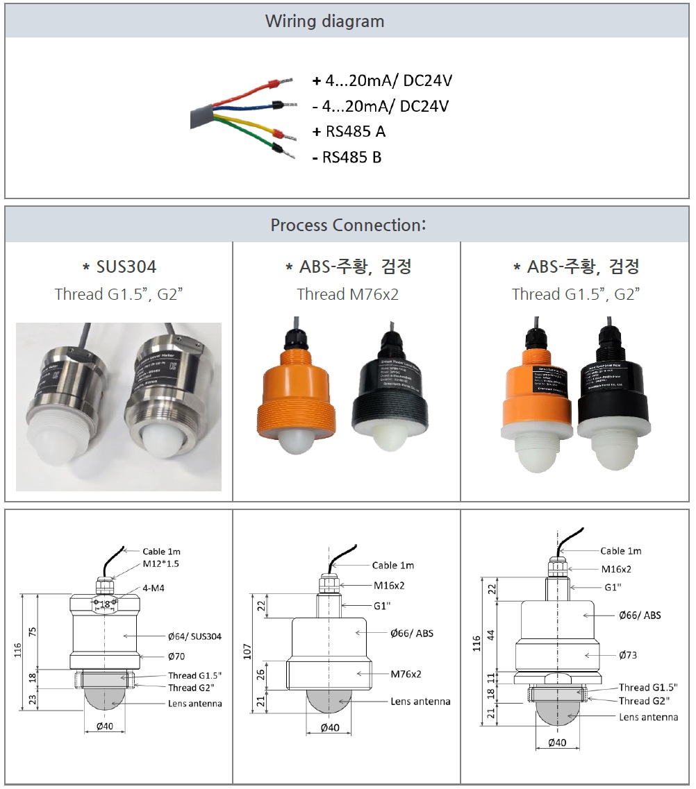 ■상품의 특징과 설명 ● 기존의 초음파 레벨 거리 미터와 26GHz 레이더 레벨 거리 미터 를 저렴한 비용으로 쉽게 교체할 수 있 고 초음파 레벨 거리 미터 및 26GHz 레이더 레벨 거리 미터 의 단점을 보완할 수 있 습니다 ● 하천, 강, 수처리장, 정수장, 양수장, 호수,식품,화학 등의 수위/거리를 측정하고 스마트 모니터링 하기에 가장 경제적 해결책을 제시할 수 있는 모델입니다. ● 측정 범위 별로 10m, 20m, 30m로 나누어집니다. ● 150~180mm 미만의 불감대로 낮은 공간에서도 측정범위가 최적화되었습니다. ● 4-20mA/ RS485를 동시에 사용 할 수 있습니다. ● 전용 앱을 통한 블루투스를 이용하여 조정 가능하며 실시간 측정값을 확인할 수 있습니다. ● 오픈 장소, 밀폐 탱크 등에 설치가 가능하며 안개 및 기후에 영향을 받지 않습니다. ● 2~3mm 이하의 오차로 정확도가 좋습니다. ● 경량 소형 사이즈로 휴대가 편리하며 설치가 간단합니다.