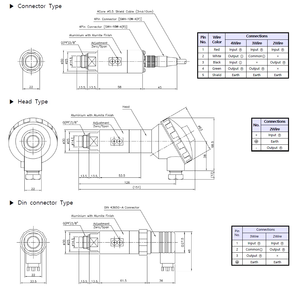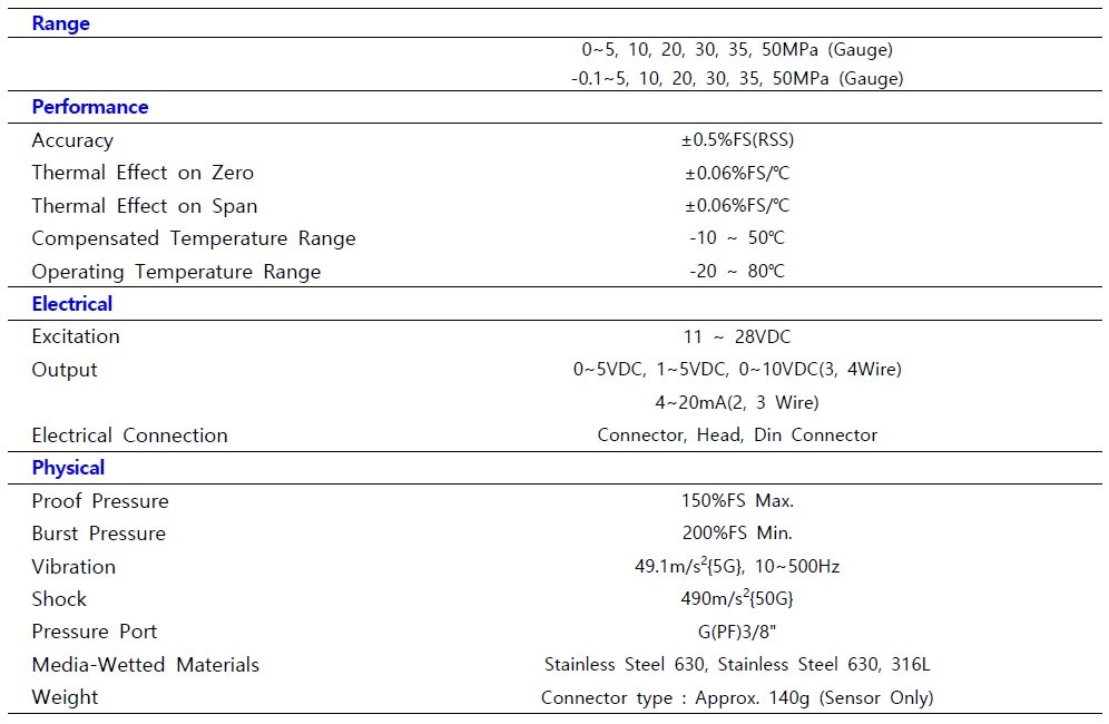 PME는 디스펜서, 식품 및 위생 설비에 사용하기 적합한 G3/8" 플러시 다이어프램 구조의 압력 포트를 갖추고 있습니다. PME 감지 소자는 자체 온도 보상 포일 스트레인 게이지를 채택하여 우수한 온도 특성을 나타냅니다. 또한 다양한 종류의 컨트롤러와 연동할 수 있도록 증폭기가 내장되어 있습니다. 특 징 ▶ Flush Diaphragm(G3/8") ▶ Built-in amplifier Circuit(VDC, mA) ▶ Measuring range 0~50MPa ▶ 0.5%FS accuracy ▶ Self temperature compensation foil strain gauge