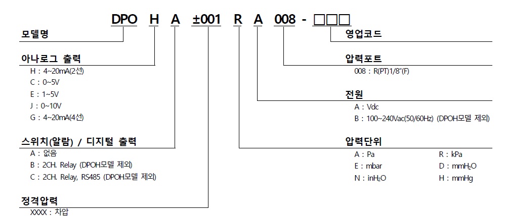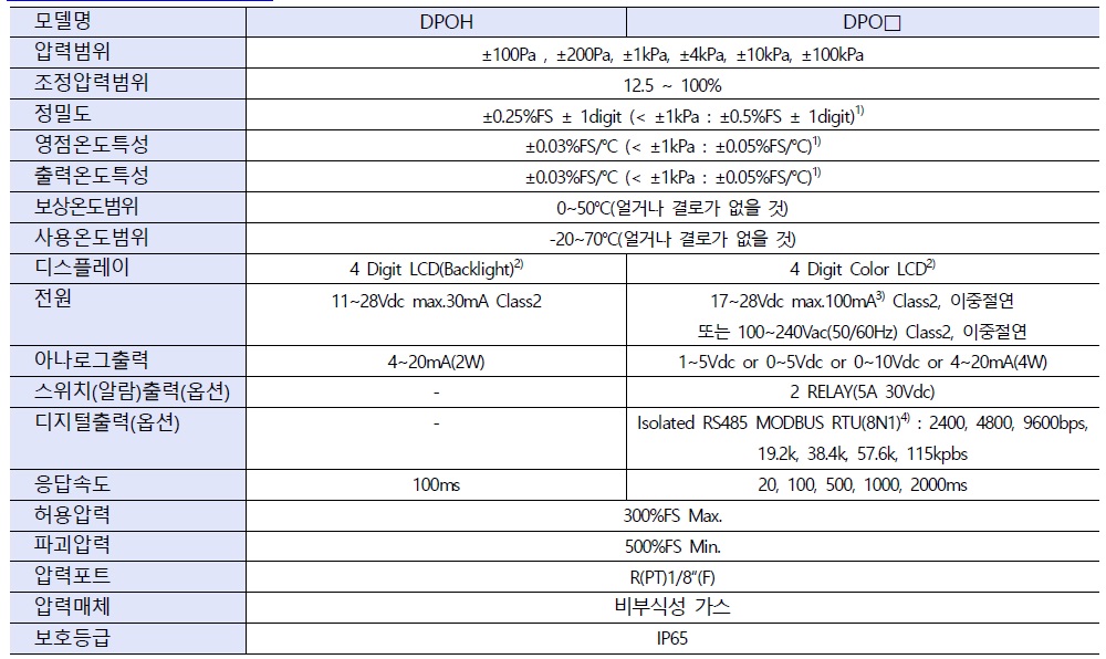 1) 정밀도 및 온도 특성은 ±100% 범위 기준입니다. (정밀도는 조정압력범위 비율에 반비례합니다.) 2) 최대 표시 범위 : -5000~5000, LCD 동작 온도 범위 : -10~70℃ 3) 스위치 출력은 포함되지 않습니다.