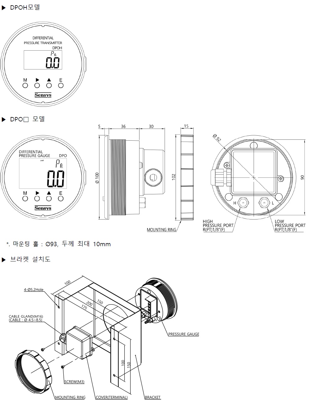 제품 소개 공조용 차압계 DPO 모델은 비부식성 가스에 사용할 수 있고 미차압, 진공 압력 및 게이지 압력을 측정할 수 있어 공조 시스템에 적합합니다. 전면 크기가 Ø100로 Ø93 마운팅홀에 부착하여 사용할 수 있습니다. 4~20mA(2선) 출력 모델(4디지트 백라이트 LCD)과 기타 출력 모델로 구분되어 있습니다. 특히 기타 출력 모델은 컬러 LCD 디스플레이를 적용하여 시인성이 뛰어나며 절연형 전원과 절연형 RS485출력으로 안정적인 사용을 할 수 있습니다. 제품 특징 ▶ CE인증 ▶ Ø93 마운팅홀 부착형 ▶ 영점조정기능 ▶ 압력범위조정기능 ▶ 절연형 전원 및 절연형 RS485 출력(4~20mA 2선 제외) ▶ 사용매체 : 비부식성 가스 제품 사용 범위 ▶ 공기흐름측정 ▶ 실내정압측정 ▶ VAV박스 ▶ 후드콘트롤 ▶ 클린룸 제품 사양