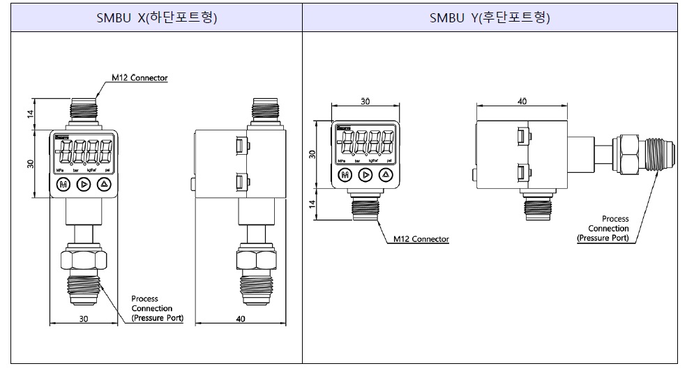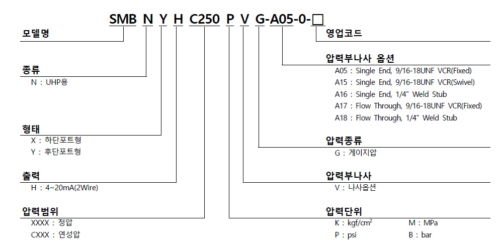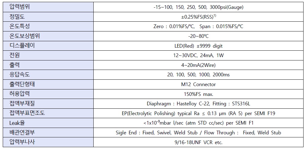 제품 소개 반도체용 압력센서 SMBN모델의 접액부 재질은 Hastelloy C22와 STS316L이며 접액부 표면을 EP처리하여 UHP(Ultra High Purity) 가스 시스템용으로 적합한 압력게이지입니다. LED 디스플래이와 2선식 4~20mA 출력으로 원거리 신호 전송 및 현장에서 압력값 확인이 가능합니다. M12커넥터를 적용하여 설치가 용이 합니다. 전면에 버튼 조작으로 영점, 응답속도, 단위변환, 스케일조정이 가능합니다.