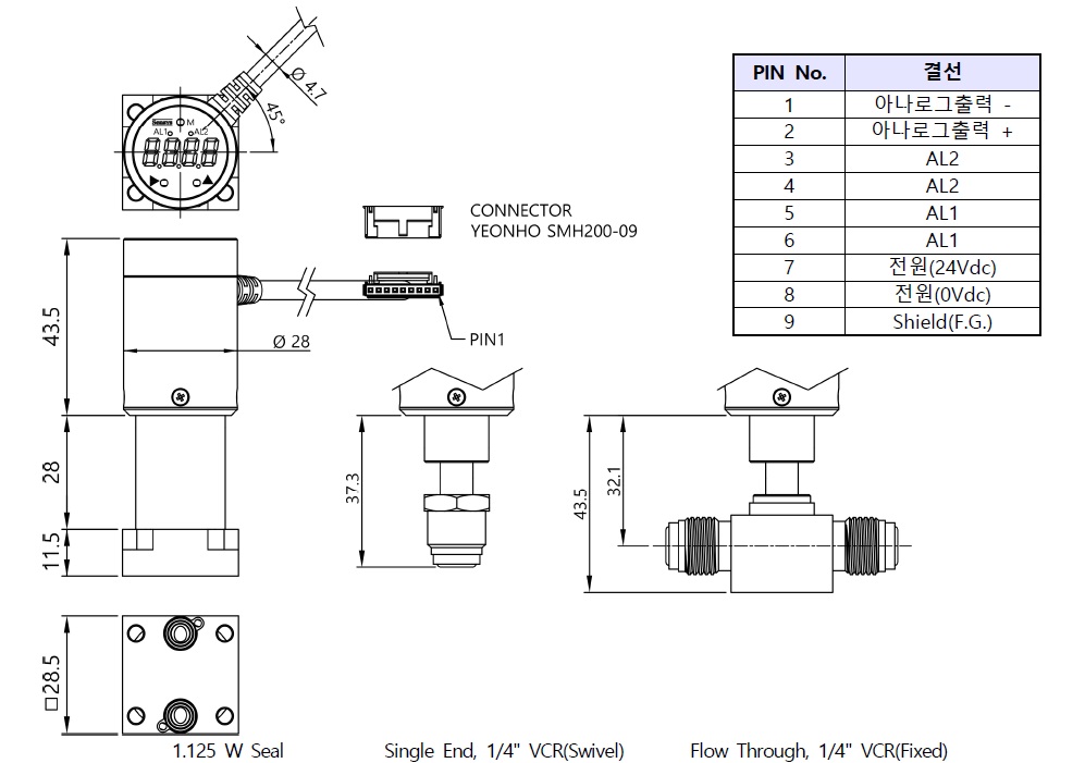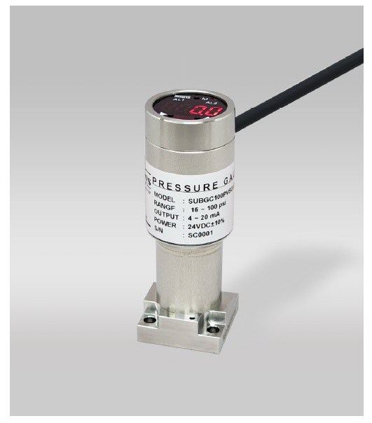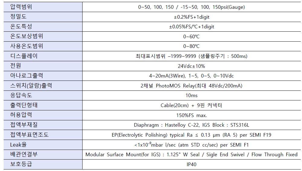 제품 소개 반도체용 압력계 SUB 반도체용 압력계 SUB 제품 소개 SUB모델의 배관연결부는 IGS 1.125" W씰, Sigle End Swivel, Flow Through Fixed로 되어 있으며 재질은 Hastelloy C22와 STS316L입니다. 접액부 표면을 EP처리하여 UHP(Ultra High Purity) 가스 시스템용으로 적합 합니다. 마이크로프로세서를 내장하고 LED 디스플래이와 아날로그 출력(4~20mA, 1~5, 0~5, 0~10Vdc), 2채널 PhotoMOS Relay 출력의 압력 게이지입니다. 소형으로 압력센서와 인디게이터, 스위치가 하나로 통합된 제품 입니다. 제품 특징 ▶ 배관연결부 형태 : IGS 1.125“ W SEAL Sigle End Swivel Flow Through Fixed ▶ 4~20mA, 1~5, 0~5, 0~10Vdc 아나로그 출력 ▶ 2채널 PhotoMOS Relay 출력 ▶ 출력단 : 케이블 20cm + 연호커넥터 9핀 ▶ 접액부재질 : Hastelloy C22, STS316L 제품 사용 범위 ▶ IGS 압력 모니터링 ▶ 가스 패널 ▶ 특수 및 벌크 가스 공급 장치 ▶ 반도체장비