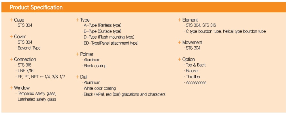 스텐레스 압력계 SD-3021는 높은 내식성과 내부 화학성을 갖추고 있습니다. 부식성 환경에 적합하도록 제작 되었습니다. 케이스, 커버, 연결부가 스테인리스 스틸로 제작되어 외관이 미려하며 정확도가 높습니다.