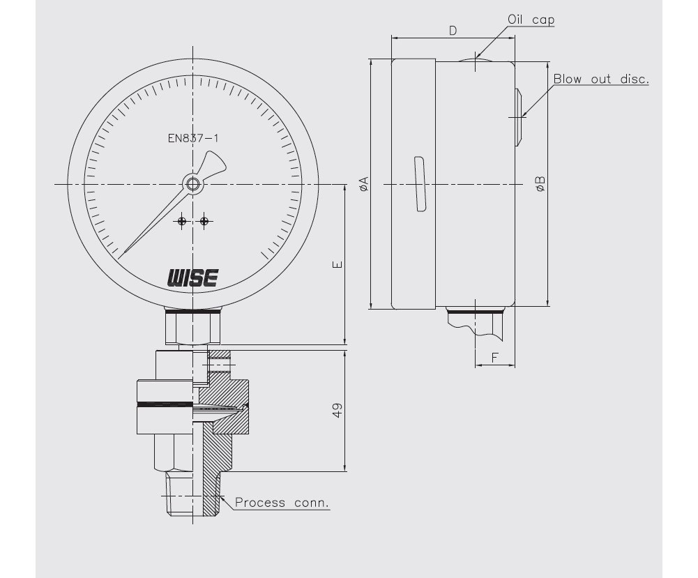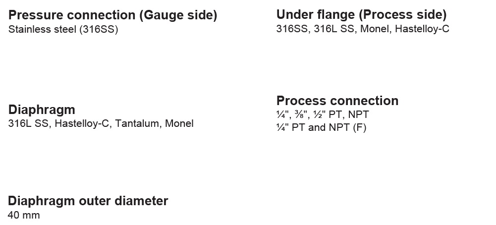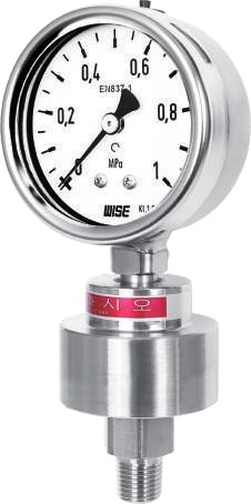 제품 개요 P701 시리즈는 압력 게이지와 결합되는 다이어프램 씰용으로 설계되었습니다. 화학 및 식품 공정에서 부식성, 오염성, 고온 또는 점성 압력 매체에 적합합니다. 제작 사양 Accuracy P2522 (63 mm) and P2523 (80 mm) : ±1.6% of full scale P2524 (100 mm) : ±1.0% of full scale Scale range (MPa, kPa, bar) -0.1 ~ 0 to -0.1 ~ 2.4 MPa 0 ~ 0.1 to 0 ~ 3.5 MPa Filling liquid Silicone oil Working pressure Steady : 75 % of full scale (63 and 80 mm) 100 % of full scale (100 mm) Over range protection : 130 % of full scale Working temperature Ambient : -20 ~ 65 °C Fluid : Max. 100 °C Degree of protection EN60529/IEC529/IP65 Temperature effect Accuracy at temperature above and below the reference temperature (20 ℃) will be effected by approximately ±0.5 % per 10 ℃ of full scale
