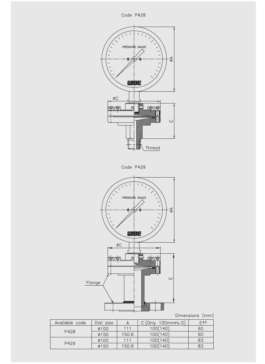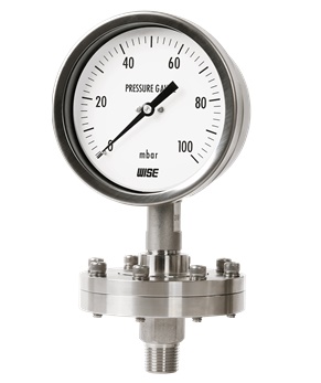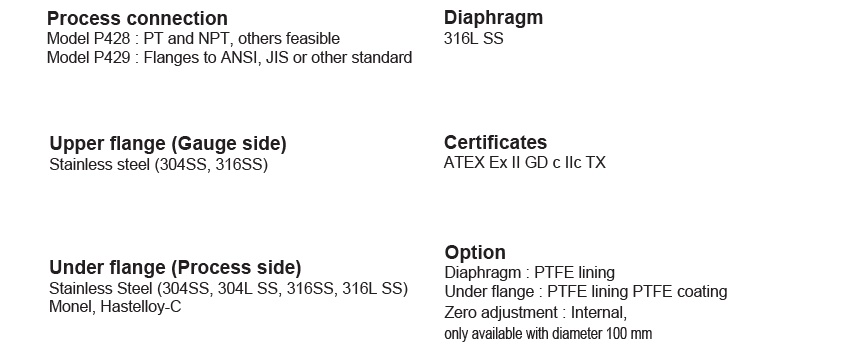 제품 소개 격막식 미압계 P428 격막식 미압계 P428 제품 개요 격막식 미압계 P428 및 P429 시리즈는 장치를 보호하도록 설계되고 부식성,오염 및 점성 압력 매체로부터 압력 게이지를 격리하도록 설계된 다이어프램으로 구성됩니다. 제작 사양 Nominal diameter 100 and 150 mm Scale range (kPa, mbar) -1 ~ 0 to -35 ~ 0 kPa 0.5 to ±15 kPa 0 ~1 to 0 ~ 35 kPa Working temperature Ambient : -20 ~ 65°C Fluid : Max. 100°C Accuracy ±1.5% of full scale