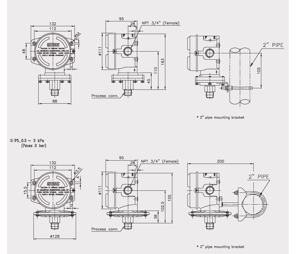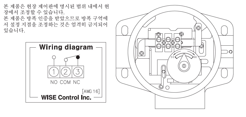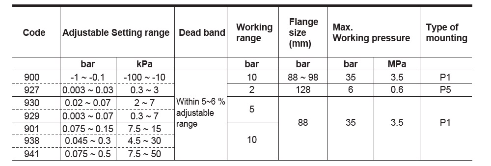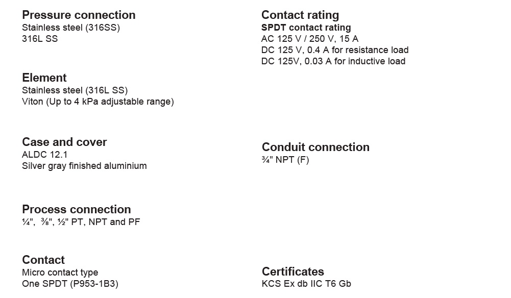 제품 개요 P955 다이어프램형 압력 스위치는 보일러 공정 라인에 사용할 수 있습니다. 내부 마이크로 스위치는 대기압이나 수압 등 다양한 유체의 압력에 의해 작동합니다. 압력 설정 범위는 조정 가능합니다. 제품 제작사양 Fluid Gas and oil Repeatability ±1.0 % of adjustable range Adjustable range (mbar, kPa, bar, MPa) 0.3 kPa to 50 kPa -1.0 ~ -0.1 bar Dead band Fixed One SPDT : Approx. 5~6 % adjustable range Working temperature Ambient : -25~65 °C (O-ring material: NBR, Viton) -40~65 °C (O-ring material: Silicone) Fluid : Max. 100 °C Degree of protection